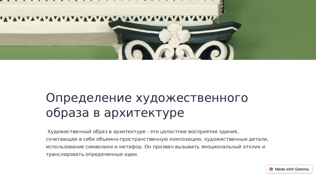 Определение художественного образа в архитектуре Художественный образ в архитектуре - это целостное восприятие здания, сочетающее в себе объемно-пространственную композицию, художественные детали, использование символики и метафор. Он призван вызывать эмоциональный отклик и транслировать определенные идеи.