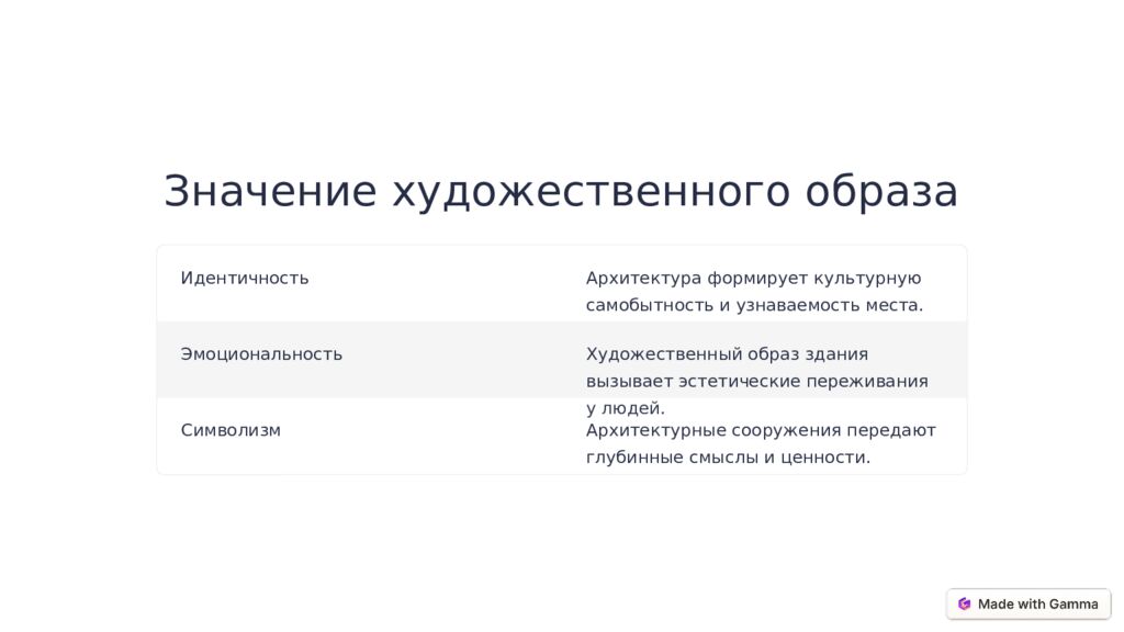 Значение художественного образа Идентичность Архитектура формирует культурную самобытность и узнаваемость места. Эмоциональность Художественный образ здания вызывает эстетические переживания у людей. Символизм Архитектурные сооружения передают глубинные смыслы и ценности.