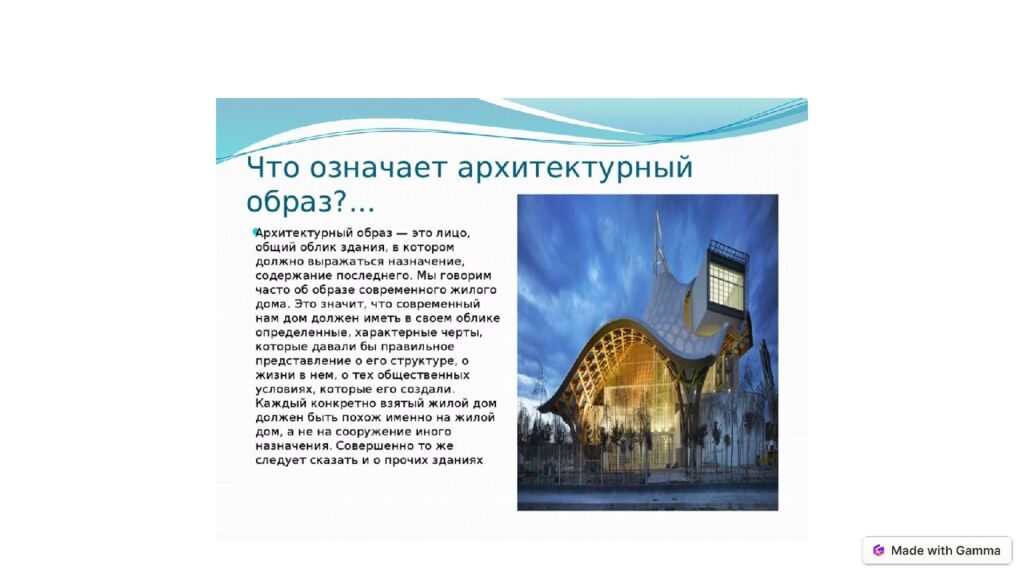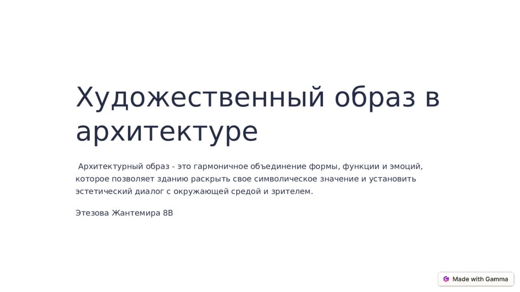 Художественный образ в архитектуре Архитектурный образ - это гармоничное объединение формы, функции и эмоций, которое позволяет зданию раскрыть свое символическое значение и установить эстетический диалог с окружающей средой и зрителем. Этезова Жантемира 8В