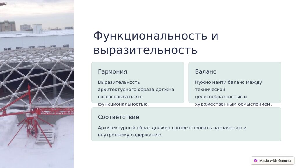 Функциональность и выразительность Гармония Выразительность архитектурного образа должна согласовываться с функциональностью. Баланс Нужно найти баланс между технической целесообразностью и художественным осмыслением. Соответствие Архитектурный образ должен соответствовать назначению и внутреннему содержанию.