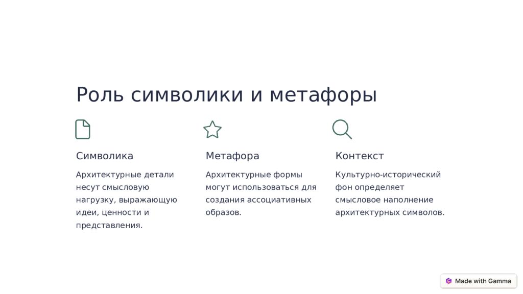 Роль символики и метафоры Символика Архитектурные детали несут смысловую нагрузку, выражающую идеи, ценности и представления. Метафора Архитектурные формы могут использоваться для создания ассоциативных образов. Контекст Культурно-исторический фон определяет смысловое наполнение архитектурных символов.