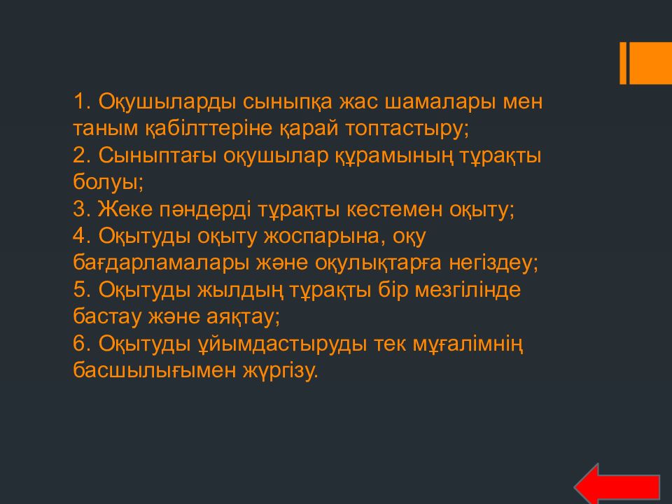 1. Оқушыларды сыныпқа жас шамалары мен таным қабілттеріне қарай топтастыру ; 2. Сыныптағы оқушылар құрамының тұрақты болуы ; 3. Жеке пәндерді тұрақты кестемен оқыту ; 4. Оқытуды оқыту жоспарына, оқу бағдарламалары және оқулықтарға негіздеу ; 5. Оқытуды жылдың тұрақты бір мезгілінде бастау және аяқтау ; 6. Оқытуды ұйымдастыруды тек мұғалімнің басшылығымен жүргізу.