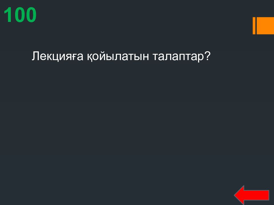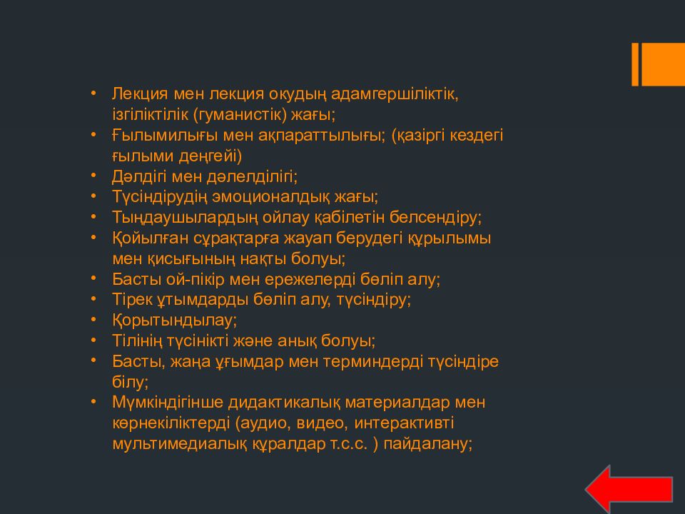 Лекция мен лекция окудың адамгершіліктік, ізгіліктілік ( гуманистік ) жағы ; Ғылымилығы мен ақпараттылығы ; ( қазіргі кездегі ғылыми деңгейі ) Дәлдігі мен дәлелділігі ; Түсіндірудің эмоционалдық жағы ; Тыңдаушылардың ойлау қабілетін белсендіру ; Қойылған сұрақтарға жауап берудегі құрылымы мен қисығының нақты болуы ; Басты ой- пікір мен ережелерді бөліп алу ; Тірек ұтымдарды бөліп алу, түсіндіру ; Қорытындылау ; Тілінің түсінікті және анық болуы ; Басты, жаңа ұғымдар мен терминдерді түсіндіре білу ; Мүмкіндігінше дидактикалық материалдар мен көрнекіліктерді (аудио, видео, интерактивті мультимедиалық кұралдар т.с.с. ) пайдалану ;