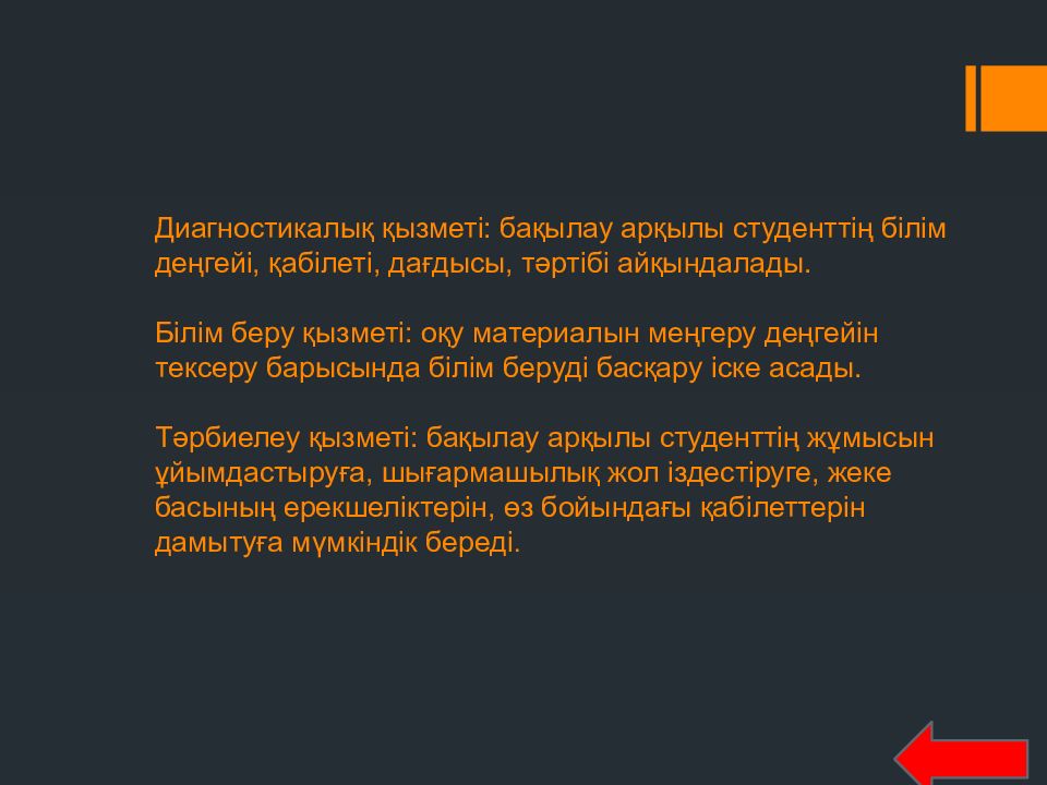 Диагностикалық қызметі : бақылау арқылы студенттің білім деңгейі, қабілеті, дағдысы, тәртібі айқындалады. Білім беру қызметі : оқу материалын меңгеру деңгейін тексеру барысында білім беруді басқару іске асады. Тәрбиелеу қызметі : бақылау арқылы студенттің жұмысын ұйымдастыруға, шығармашылық жол іздестіруге, жеке басының ерекшеліктерін, өз бойындағы қабілеттерін дамытуға мүмкіндік береді.