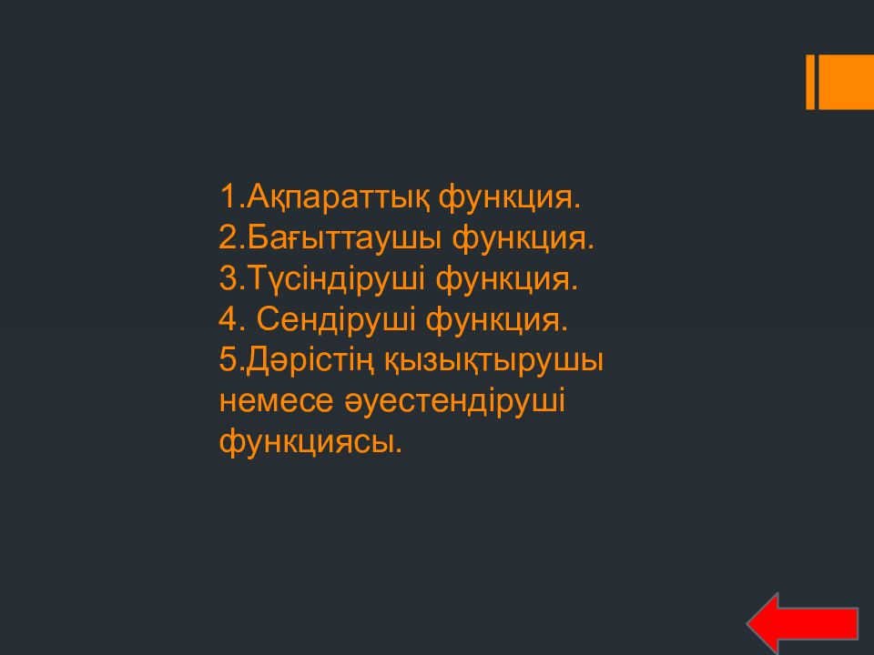1.Ақпараттық функция. 2.Бағыттаушы функция. 3.Түсіндіруші функция. 4. Сендіруші функция. 5. Дәрістің қызықтырушы немесе әуестендіруші функциясы.