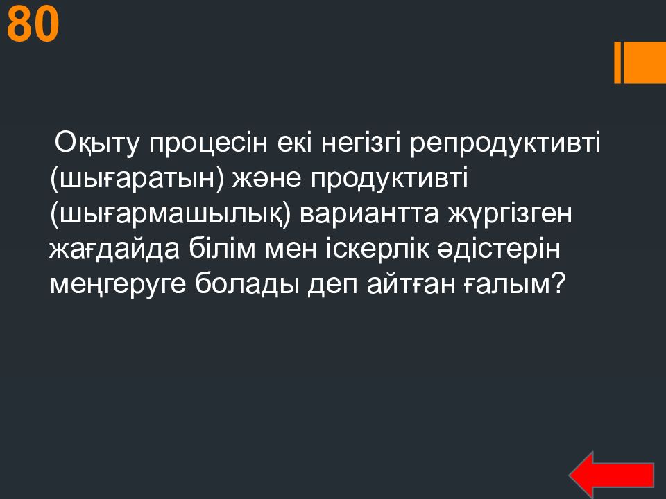 Оқыту процесін екі негізгі репродуктивті ( шығаратын ) және продуктивті ( шығармашылық ) вариантта жүргізген жағдайда білім мен іскерлік әдістерін меңгеруге болады деп айтған ғалым ?