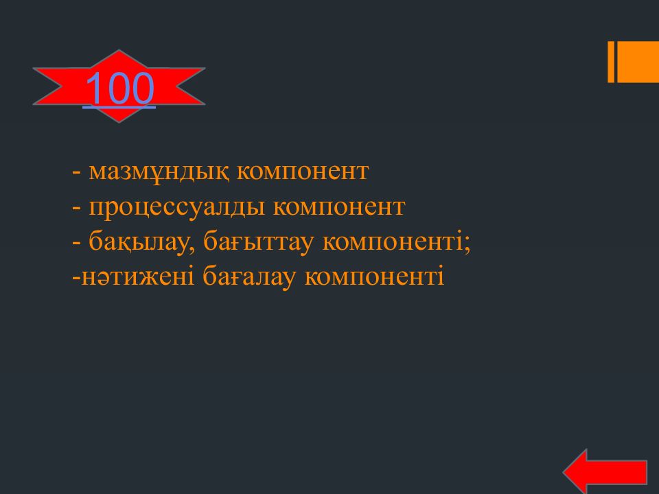 Слайд 4: мазмұндық компонент - процессуалды компонент - бақылау, бағыттау компоненті ; - нәтижені бағалау компоненті