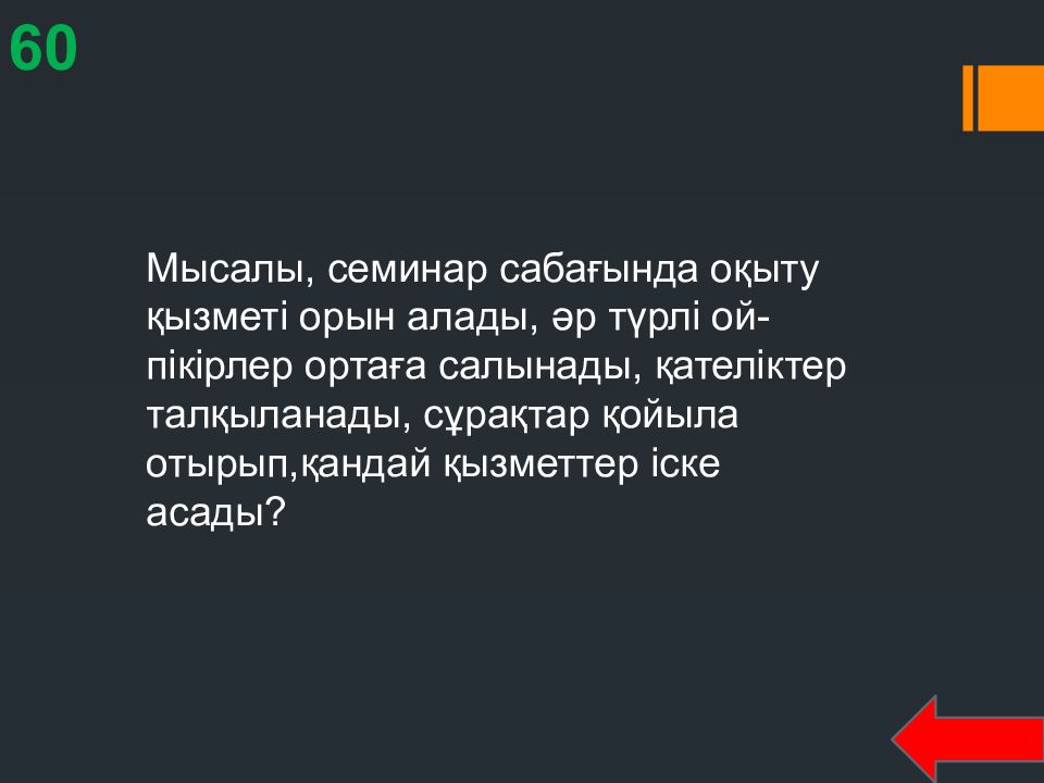 Мысалы, семинар сабағында оқыту қызметі орын алады, әр түрлі ой- пікірлер ортаға салынады, қателіктер талқыланады, сұрақтар қойыла отырып,қандай қызметтер іске асады ?