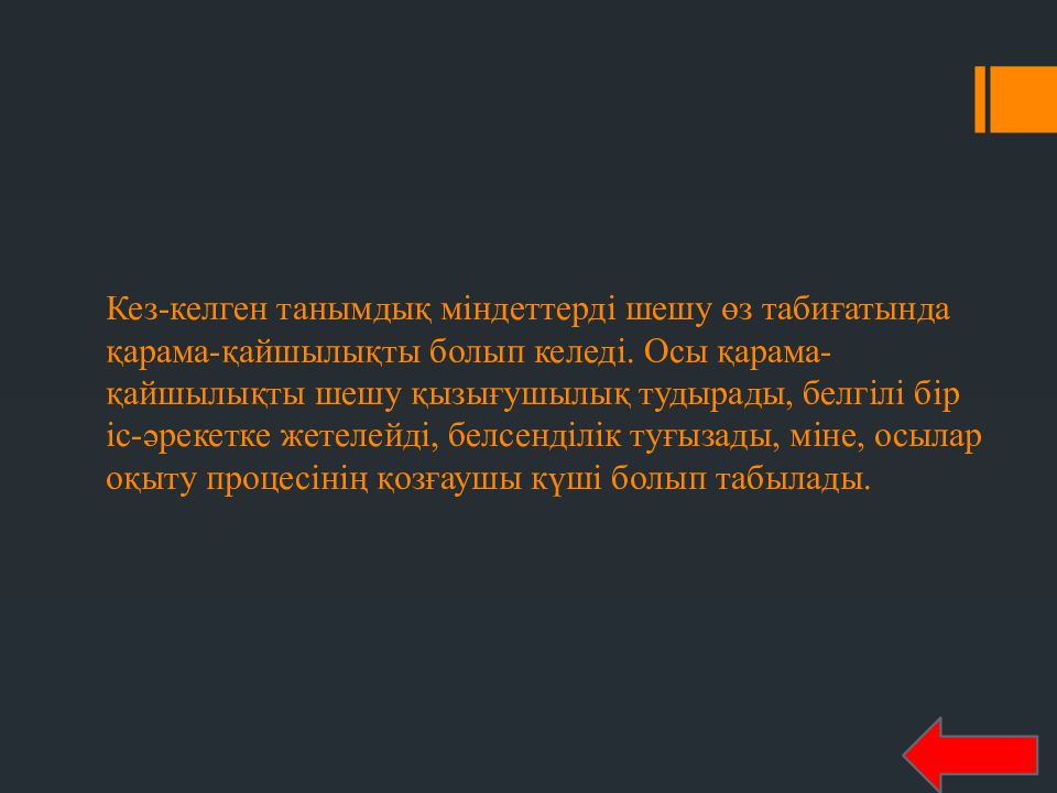 Кез-келген танымдық міндеттерді шешу өз табиғатында қарама-қайшылықты болып келеді. Осы қарама-қайшылықты шешу қызығушылық тудырады, белгілі бір іс-әрекетке жетелейді, белсенділік туғызады, міне, осылар оқыту процесінің қозғаушы күші болып табылады.