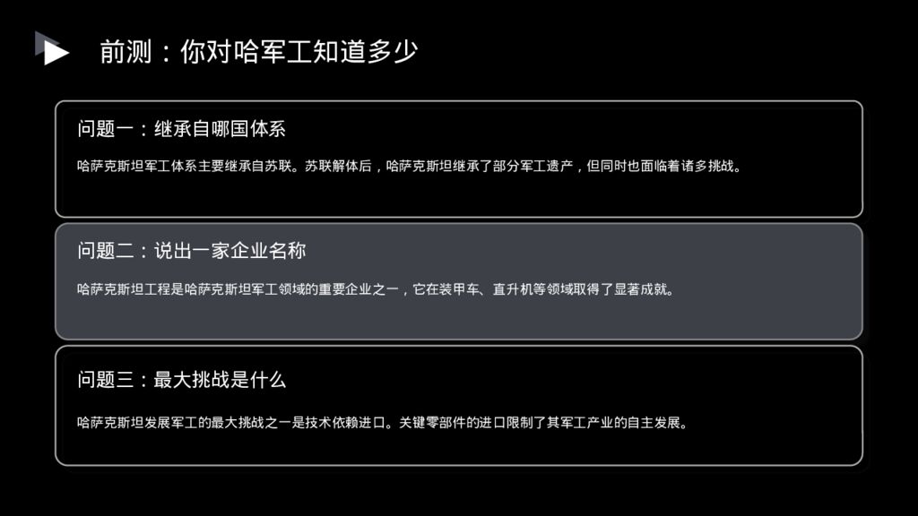 前测:你对哈军工知道多少 问题一:继承自哪国体系 哈萨克斯坦军工体系主要继承自苏联。苏联解体后,哈萨克斯坦继承了部分军工遗产,但同时也面临着诸多挑战。 问题二:说出一家企业名称 哈萨克斯坦工程是哈萨克斯坦军工领域的重要企业之一,它在装甲车、直升机等领域取得了显著成就。 问题三:最大挑战是什么 哈萨克斯坦发展军工的最大挑战之一是技术依赖进口。关键零部件的进口限制了其军工产业的自主发展。