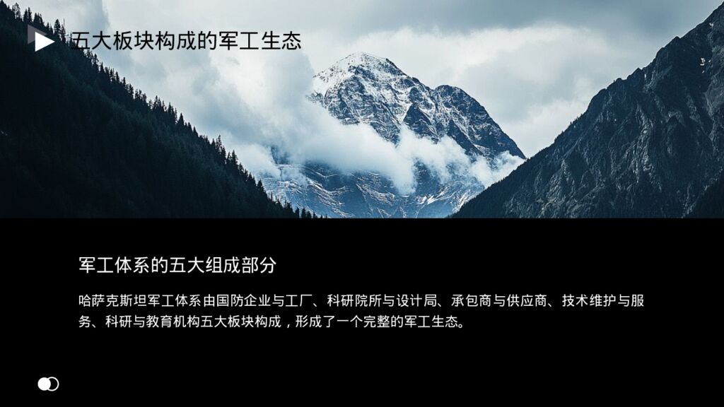 五大板块构成的军工生态 军工体系的五大组成部分 哈萨克斯坦军工体系由国防企业与工厂、科研院所与设计局、承包商与供应商、技术维护与服务、科研与教育机构五大板块构成,形成了一个完整的军工生态。
