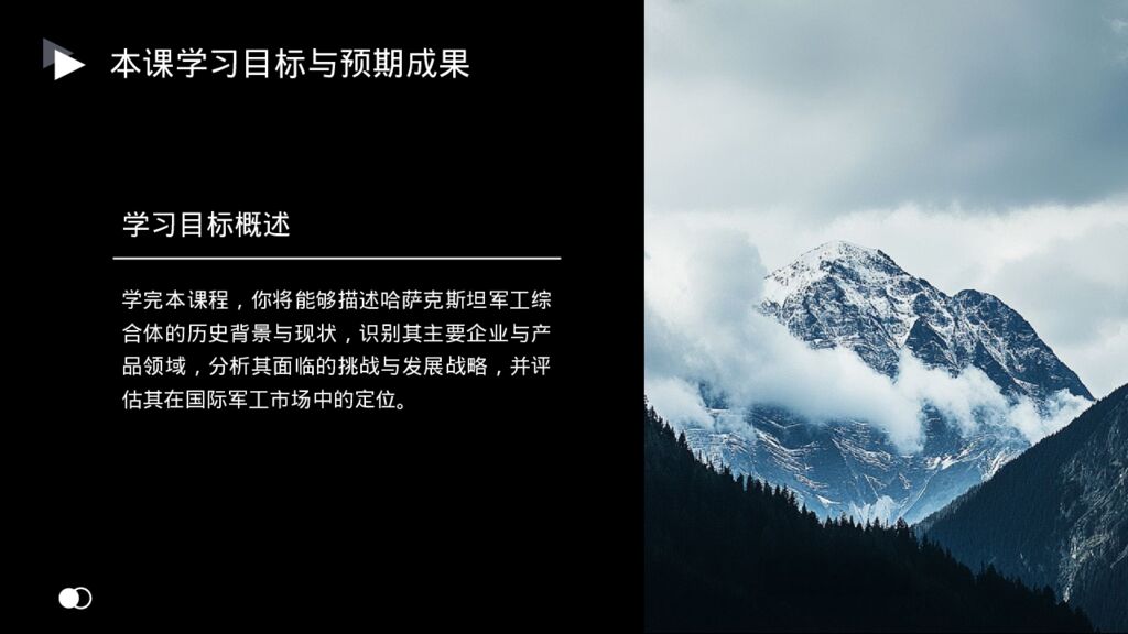 本课学习目标与预期成果 学习目标概述 学完本课程,你将能够描述哈萨克斯坦军工综合体的历史背景与现状,识别其主要企业与产品领域,分析其面临的挑战与发展战略,并评估其在国际军工市场中的定位。
