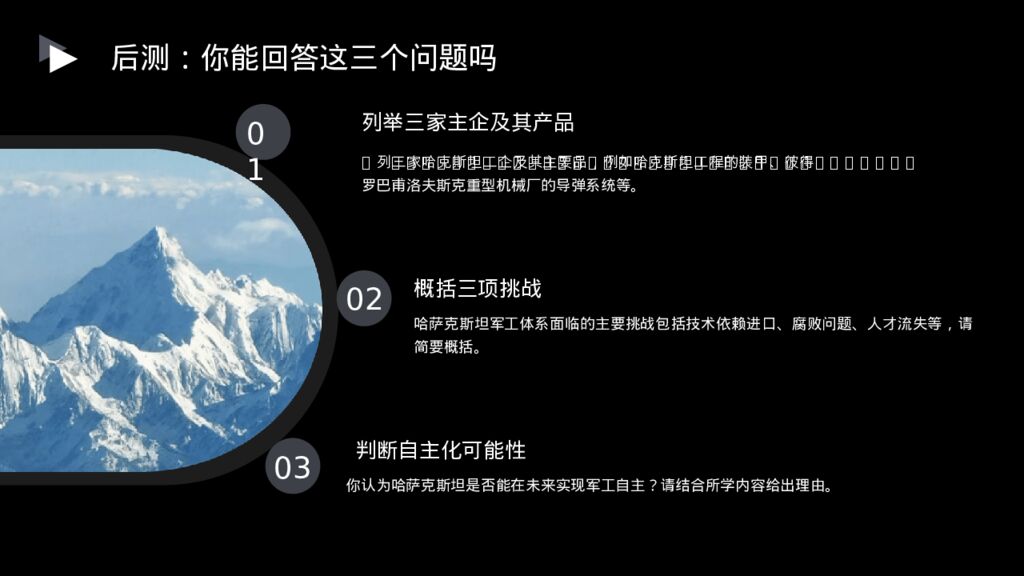 后测:你能回答这三个问题吗 01 列举三家主企及其产品 请列举三家哈萨克斯坦军工企业及其主要产品,例如哈萨克斯坦工程的装甲车、彼得罗巴甫洛夫斯克重型机械厂的导弹系统等。 02 概括三项挑战 哈萨克斯坦军工体系面临的主要挑战包括技术依赖进口、腐败问题、人才流失等,请简要概括。 03 判断自主化可能性 你认为哈萨克斯坦是否能在未来实现军工自主?请结合所学内容给出理由。