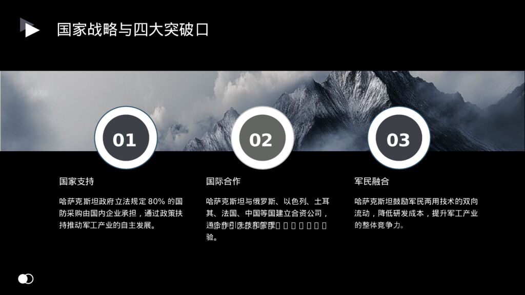 国家战略与四大突破口 01 国家支持 哈萨克斯坦政府立法规定80%的国防采购由国内企业承担,通过政策扶持推动军工产业的自主发展。 02 国际合作 哈萨克斯坦与俄罗斯、以色列、土耳其、法国、中国等国建立合资公司,通过国际合作引进先进技术和管理经验。 03 军民融合 哈萨克斯坦鼓励军民两用技术的双向流动,降低研发成本,提升军工产业的整体竞争力。