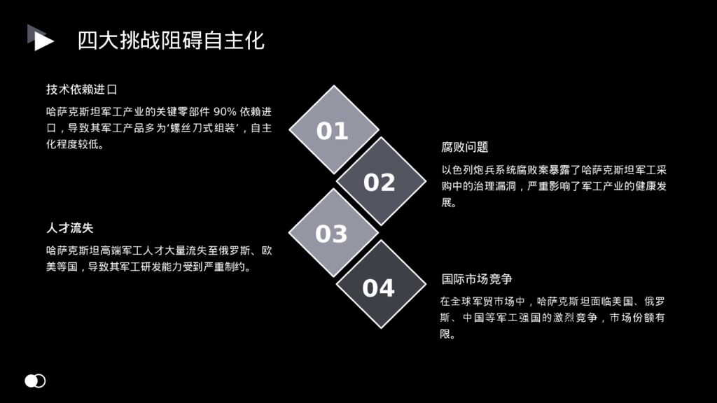 四大挑战阻碍自主化 01 技术依赖进口 哈萨克斯坦军工产业的关键零部件90%依赖进口,导致其军工产品多为‘螺丝刀式组装’,自主化程度较低。 02 腐败问题 以色列炮兵系统腐败案暴露了哈萨克斯坦军工采购中的治理漏洞,严重影响了军工产业的健康发展。 03 人才流失 哈萨克斯坦高端军工人才大量流失至俄罗斯、欧美等国,导致其军工研发能力受到严重制约。 04 国际市场竞争 在全球军贸市场中,哈萨克斯坦面临美国、俄罗斯、中国等军工强国的激烈竞争,市场份额有限。