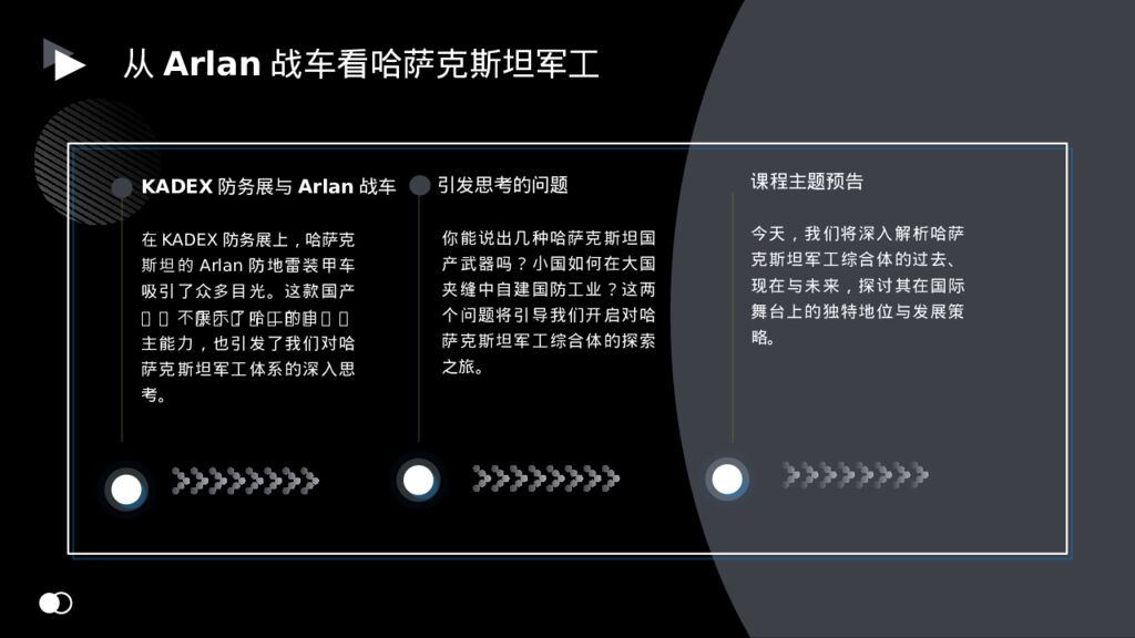 从Arlan战车看哈萨克斯坦军工 KADEX防务展与Arlan战车 在KADEX防务展上,哈萨克斯坦的Arlan防地雷装甲车吸引了众多目光。这款国产战车不仅展示了哈军工的自主能力,也引发了我们对哈萨克斯坦军工体系的深入思考。 引发思考的问题 你能说出几种哈萨克斯坦国产武器吗?小国如何在大国夹缝中自建国防工业?这两个问题将引导我们开启对哈萨克斯坦军工综合体的探索之旅。 课程主题预告 今天,我们将深入解析哈萨克斯坦军工综合体的过去、现在与未来,探讨其在国际舞台上的独特地位与发展策略。
