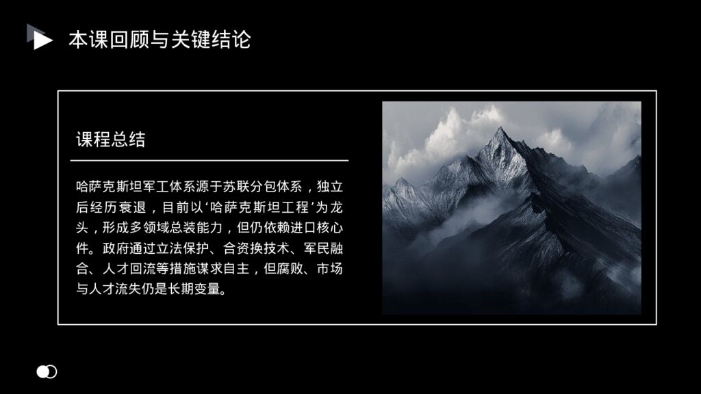 本课回顾与关键结论 课程总结 哈萨克斯坦军工体系源于苏联分包体系,独立后经历衰退,目前以‘哈萨克斯坦工程’为龙头,形成多领域总装能力,但仍依赖进口核心件。政府通过立法保护、合资换技术、军民融合、人才回流等措施谋求自主,但腐败、市场与人才流失仍是长期变量。