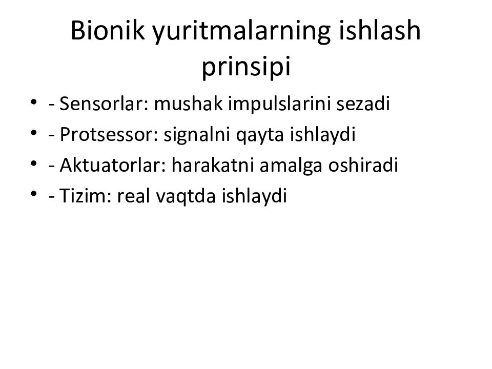 - Sensorlar: mushak impulslarini sezadi - Protsessor: signalni qayta ishlaydi - Aktuatorlar: harakatni amalga oshiradi - Tizim: real vaqtda ishlaydi