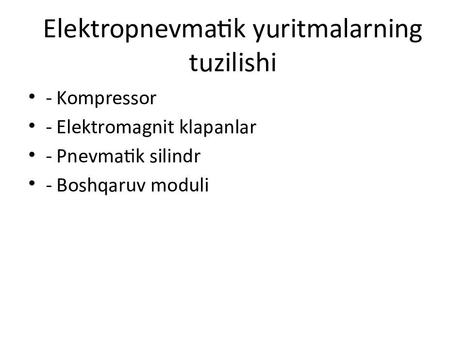 - Kompressor - Elektromagnit klapanlar - Pnevmatik silindr - Boshqaruv moduli