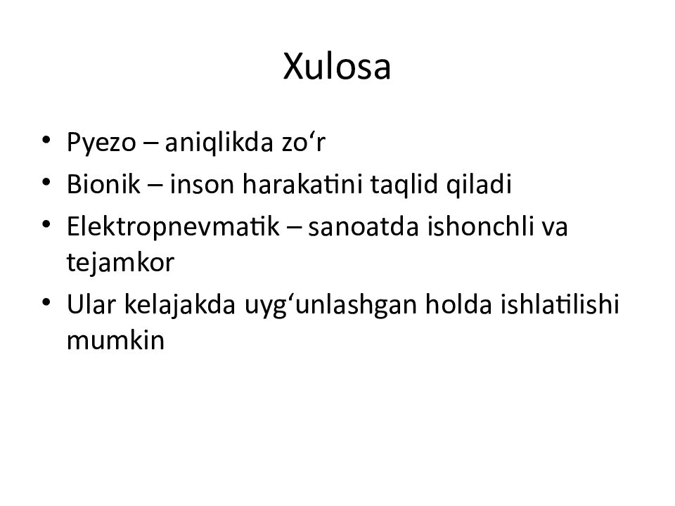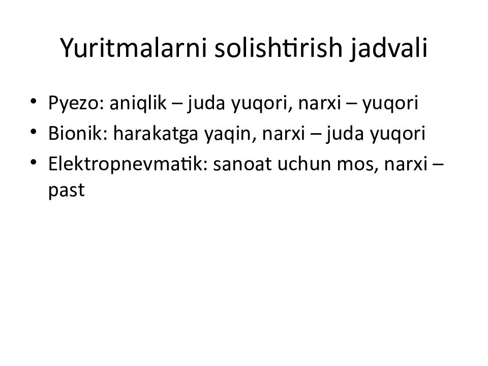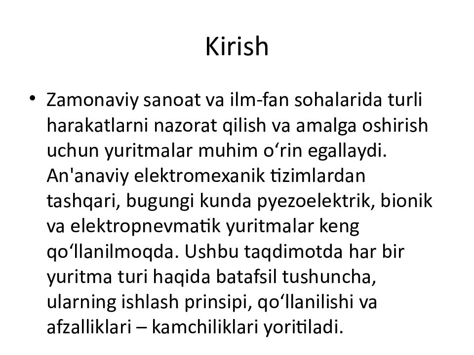 Zamonaviy sanoat va ilm-fan sohalarida turli harakatlarni nazorat qilish va amalga oshirish uchun yuritmalar muhim o‘rin egallaydi. An'anaviy elektromexanik tizimlardan tashqari, bugungi kunda pyezoelektrik, bionik va elektropnevmatik yuritmalar keng qo‘llanilmoqda. Ushbu taqdimotda har bir yuritma turi haqida batafsil tushuncha, ularning ishlash prinsipi, qo‘llanilishi va afzalliklari – kamchiliklari yoritiladi.