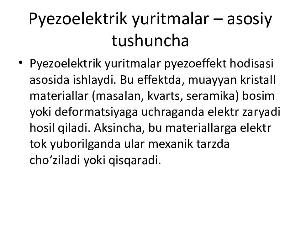 Pyezoelektrik yuritmalar pyezoeffekt hodisasi asosida ishlaydi. Bu effektda, muayyan kristall materiallar (masalan, kvarts, seramika) bosim yoki deformatsiyaga uchraganda elektr zaryadi hosil qiladi. Aksincha, bu materiallarga elektr tok yuborilganda ular mexanik tarzda cho‘ziladi yoki qisqaradi.