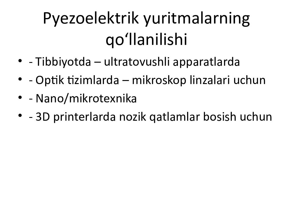 - Tibbiyotda – ultratovushli apparatlarda - Optik tizimlarda – mikroskop linzalari uchun - Nano/mikrotexnika - 3D printerlarda nozik qatlamlar bosish uchun