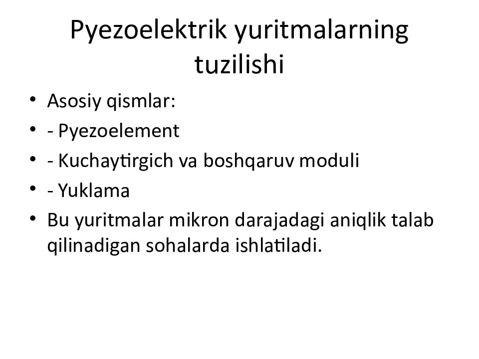 Asosiy qismlar: - Pyezoelement - Kuchaytirgich va boshqaruv moduli - Yuklama Bu yuritmalar mikron darajadagi aniqlik talab qilinadigan sohalarda ishlatiladi.