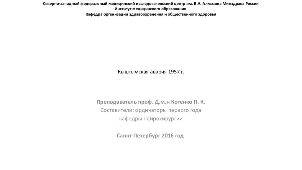 Преподаватель проф. Д.м.н Котенко П. К. Составители : ординаторы первого года кафедры нейрохирургии Санкт-Петербург 2016 год Северно-западный федеральный медицинский исследовательский центр им. В.А. Алмазова Минздрава России Институт медицинского образования Кафедра организации здравоохранения и общественного здоровья