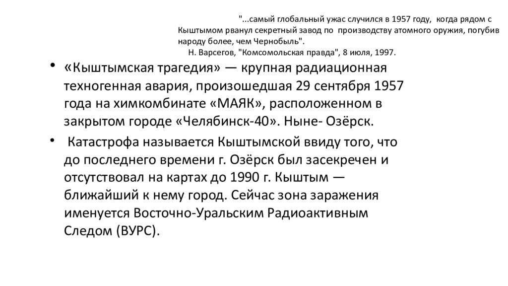 "...самый глобальный ужас случился в 1957 году, когда рядом с Кыштымом рванул секретный завод по производству атомного оружия, погубив народу более, чем Чернобыль". Н. Варсегов, "Комсомольская правда", 8 июля, 1997. « Кыштымская трагедия» — крупная радиационная техногенная авария, произошедшая 29 сентября 1957 года на химкомбинате «МАЯК», расположенном в закрытом городе «Челябинск-40». Ныне- Озёрск. Катастрофа называется Кыштымской ввиду того, что до последнего времени г. Озёрск был засекречен и отсутствовал на картах до 1990 г. Кыштым — ближайший к нему город. Сейчас зона заражения именуется Восточно-Уральским Радиоактивным Следом (ВУРС).