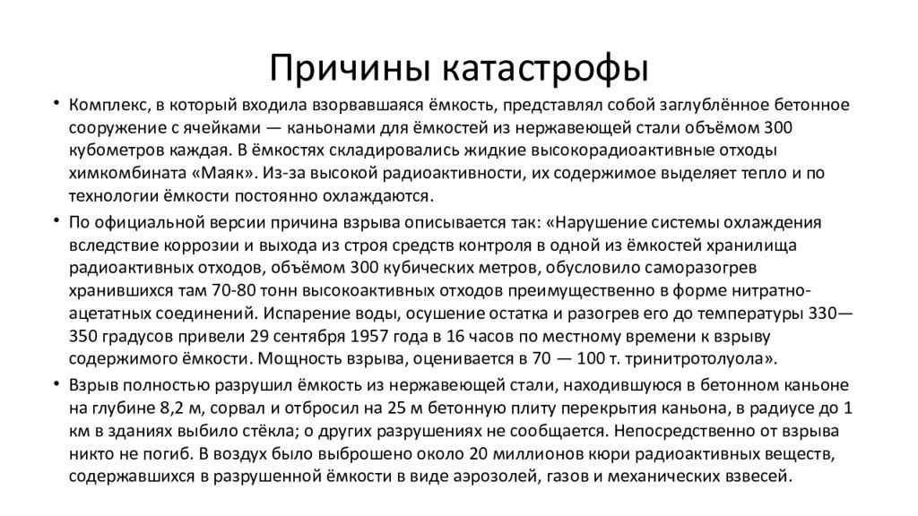 Комплекс, в который входила взорвавшаяся ёмкость, представлял собой заглублённое бетонное сооружение с ячейками — каньонами для ёмкостей из нержавеющей стали объёмом 300 кубометров каждая. В ёмкостях складировались жидкие высокорадиоактивные отходы химкомбината «Маяк». Из-за высокой радиоактивности, их содержимое выделяет тепло и по технологии ёмкости постоянно охлаждаются. По официальной версии причина взрыва описывается так: «Нарушение системы охлаждения вследствие коррозии и выхода из строя средств контроля в одной из ёмкостей хранилища радиоактивных отходов, объёмом 300 кубических метров, обусловило саморазогрев хранившихся там 70-80 тонн высокоактивных отходов преимущественно в форме нитратно-ацетатных соединений. Испарение воды, осушение остатка и разогрев его до температуры 330—350 градусов привели 29 сентября 1957 года в 16 часов по местному времени к взрыву содержимого ёмкости. Мощность взрыва, оценивается в 70 — 100 т. тринитротолуола». Взрыв полностью разрушил ёмкость из нержавеющей стали, находившуюся в бетонном каньоне на глубине 8,2 м, сорвал и отбросил на 25 м бетонную плиту перекрытия каньона, в радиусе до 1 км в зданиях выбило стёкла; о других разрушениях не сообщается. Непосредственно от взрыва никто не погиб. В воздух было выброшено около 20 миллионов кюри радиоактивных веществ, содержавшихся в разрушенной ёмкости в виде аэрозолей, газов и механических взвесей.