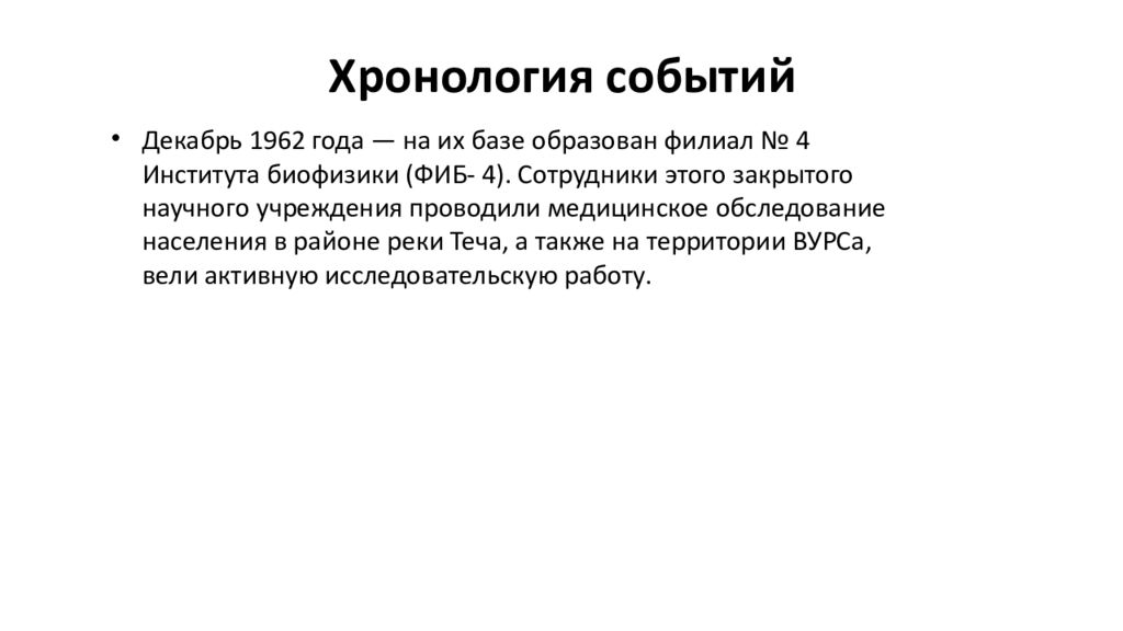 Декабрь 1962 года — на их базе образован филиал № 4 Института биофизики (ФИБ- 4). Сотрудники этого закрытого научного учреждения проводили медицинское обследование населения в районе реки Теча, а также на территории ВУРСа, вели активную исследовательскую работу.