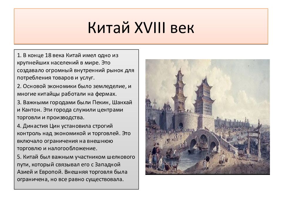 1. В конце 18 века Китай имел одно из крупнейших населений в мире. Это создавало огромный внутренний рынок для потребления товаров и услуг. 2. Основой экономики было земледелие, и многие китайцы работали на фермах. 3. Важными городами были Пекин, Шанхай и Кантон. Эти города служили центрами торговли и производства. 4. Династия Цин установила строгий контроль над экономикой и торговлей. Это включало ограничения на внешнюю торговлю и налогообложение. 5. Китай был важным участником шелкового пути, который связывал его с Западной Азией и Европой. Внешняя торговля была ограничена, но все равно существовала.