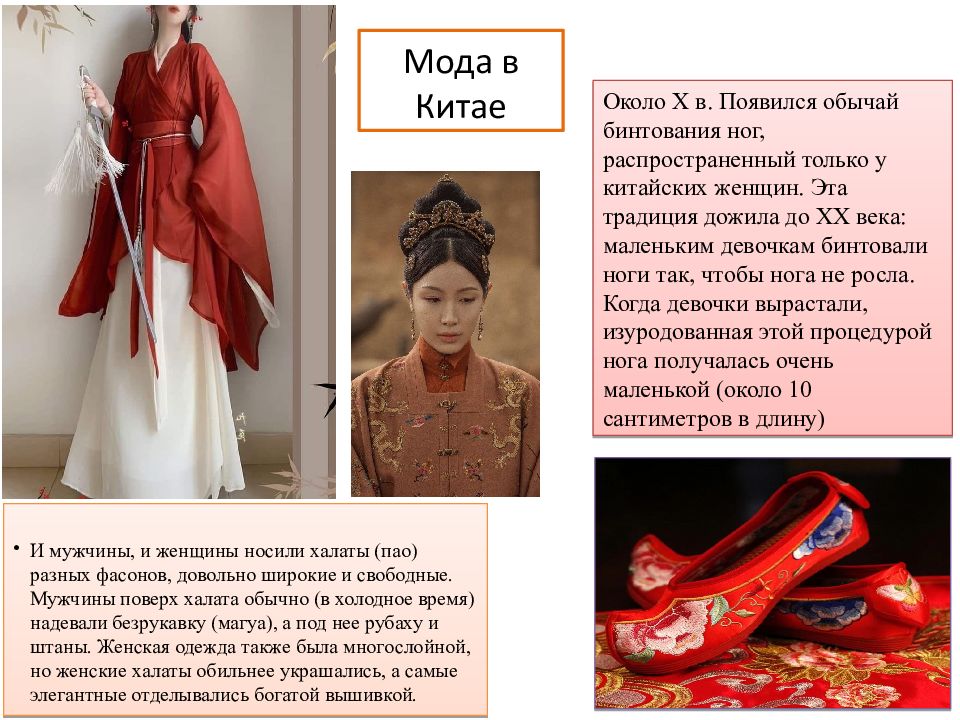 Мода в Китае Около X в. Появился обычай бинтования ног, распространенный только у китайских женщин. Эта традиция дожила до XX века: маленьким девочкам бинтовали ноги так, чтобы нога не росла. Когда девочки вырастали, изуродованная этой процедурой нога получалась очень маленькой (около 10 сантиметров в длину) И мужчины, и женщины носили халаты (пао) разных фасонов, довольно широкие и свободные. Мужчины поверх халата обычно (в холодное время) надевали безрукавку (магуа), а под нее рубаху и штаны. Женская одежда также была многослойной, но женские халаты обильнее украшались, а самые элегантные отделывались богатой вышивкой.