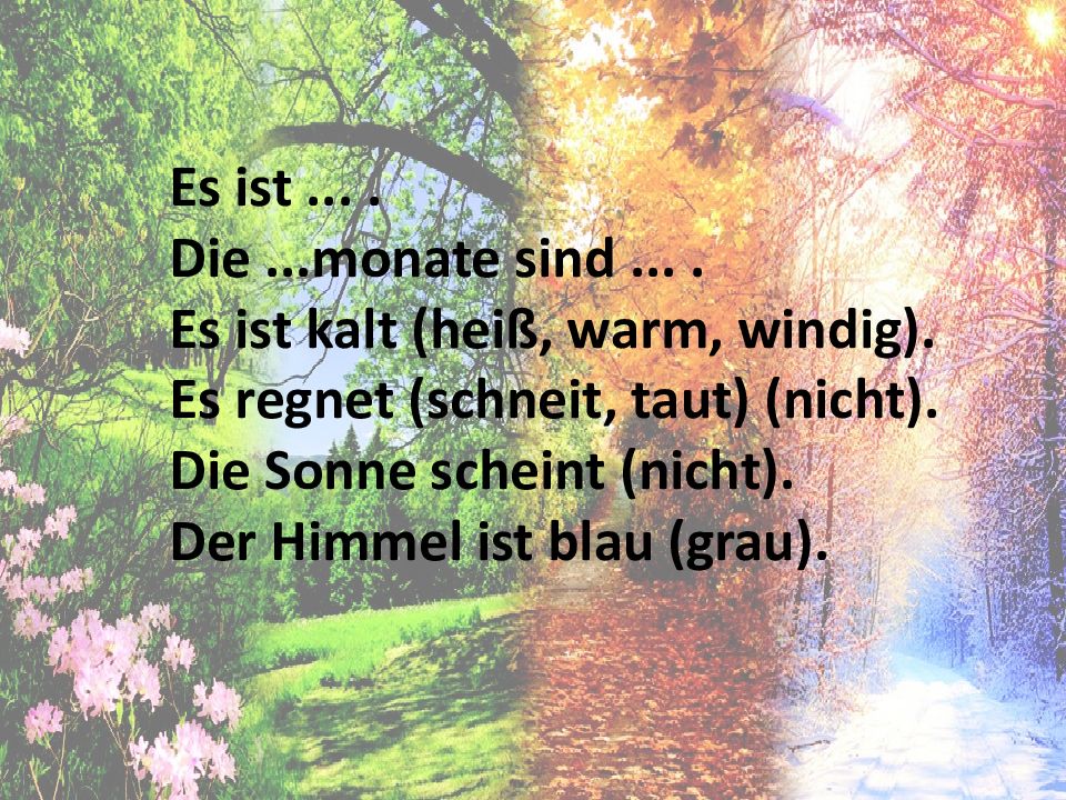 Es ist.... Die... monate sind.... Es ist kalt (heiß, warm, windig). Es regnet (schneit, taut) (nicht). Die Sonne scheint (nicht). Der Himmel ist blau (grau).