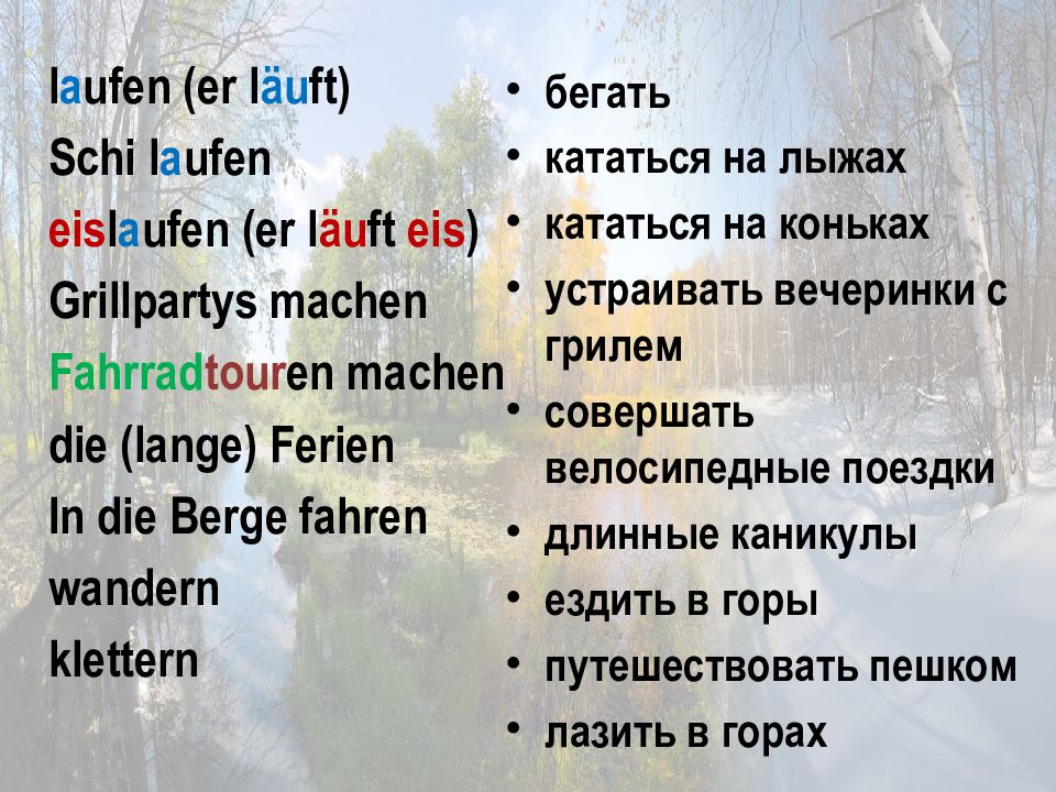 l a ufen (er l äu ft) Schi l a ufen eis l a ufen (er l äu ft eis ) Grillpartys machen Fahrrad tour en machen die (lange) Ferien In die Berge fahren wandern klettern бегать кататься на лыжах кататься на коньках устраивать вечеринки с грилем совершать велосипедные поездки длинные каникулы ездить в горы путешествовать пешком лазить в горах