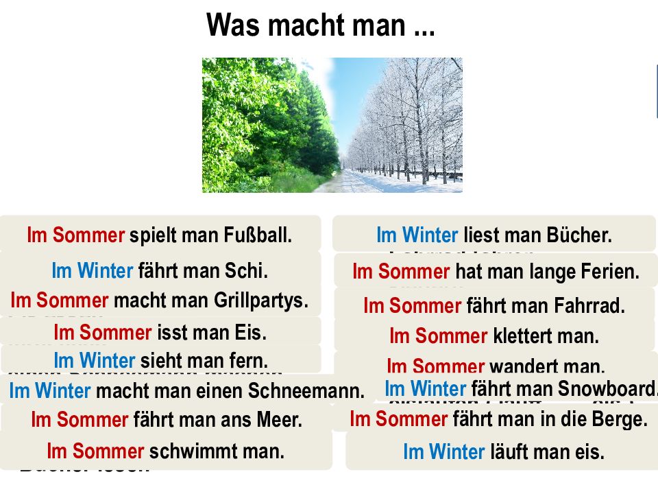 ... im Sommer? ... im Winter? Fußball spielen Schi fahren Grillpartys machen Eis essen fernsehen einen Schneemann machen ans Meer fahren schwimmen Bücher lesen lange Ferien haben Fahrrad fahren klettern wandern Snowboard fahren in die Berge fahren eislaufen ( läuft … eis ) Im Sommer spielt man Fußball. Im Winter fährt man Schi. Im Sommer macht man Grillpartys. Im Sommer isst man Eis. Im Winter sieht man fern. Im Winter macht man einen Schneemann. Im Sommer fährt man ans Meer. Im Sommer schwimmt man. Im Winter liest man Bücher. Im Sommer hat man lange Ferien. Im Sommer fährt man Fahrrad. Im Sommer klettert man. Im Sommer wandert man. Im Winter fährt man Snowboard. Im Sommer fährt man in die Berge. Im Winter läuft man eis.