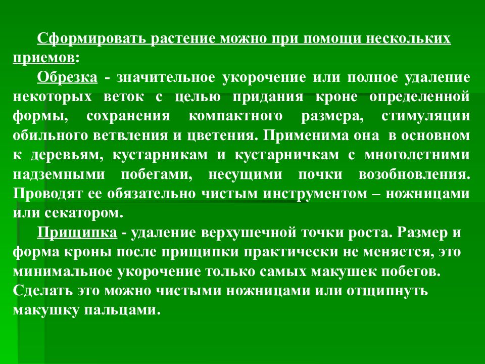 Сформировать растение можно при помощи нескольких приемов : Обрезка - значительное укорочение или полное удаление некоторых веток с целью придания кроне определенной формы, сохранения компактного размера, стимуляции обильного ветвления и цветения. Применима она в основном к деревьям, кустарникам и кустарничкам с многолетними надземными побегами, несущими почки возобновления. Проводят ее обязательно чистым инструментом – ножницами или секатором. Прищипка - удаление верхушечной точки роста. Размер и форма кроны после прищипки практически не меняется, это минимальное укорочение только самых макушек побегов. Сделать это можно чистыми ножницами или отщипнуть макушку пальцами.