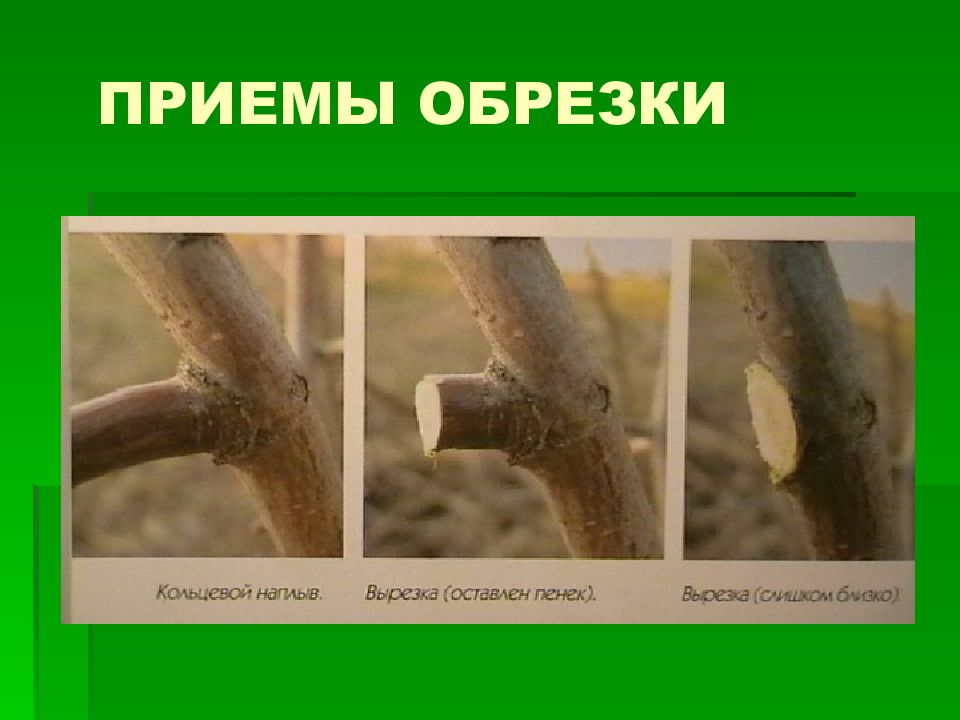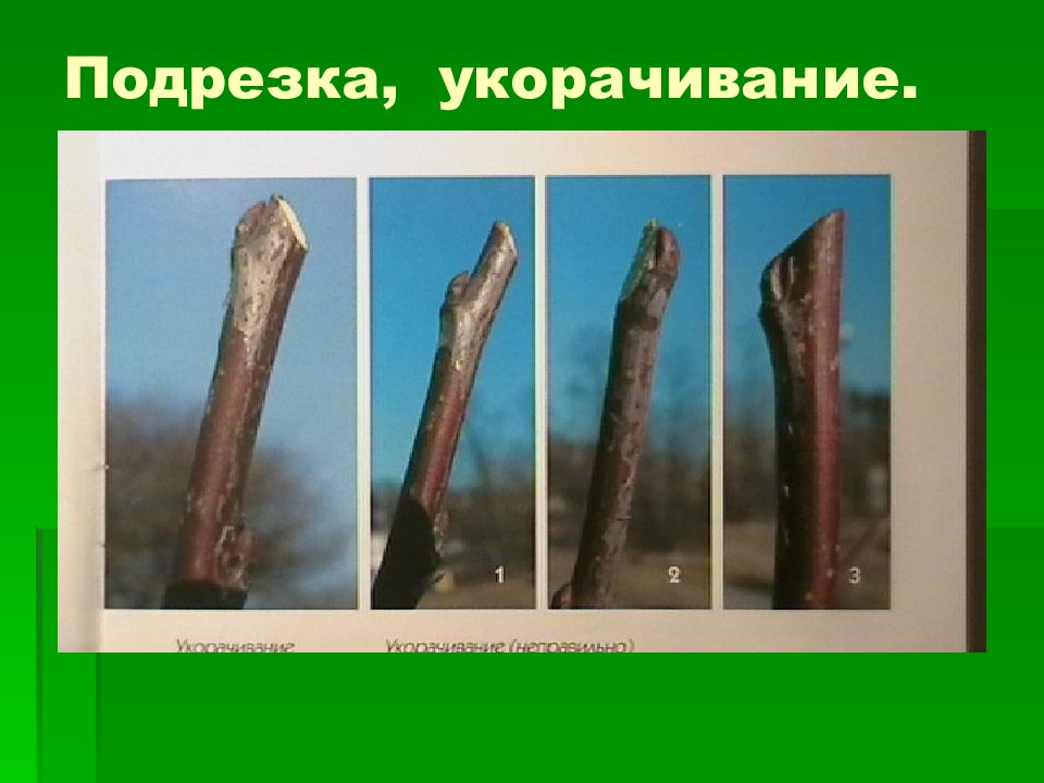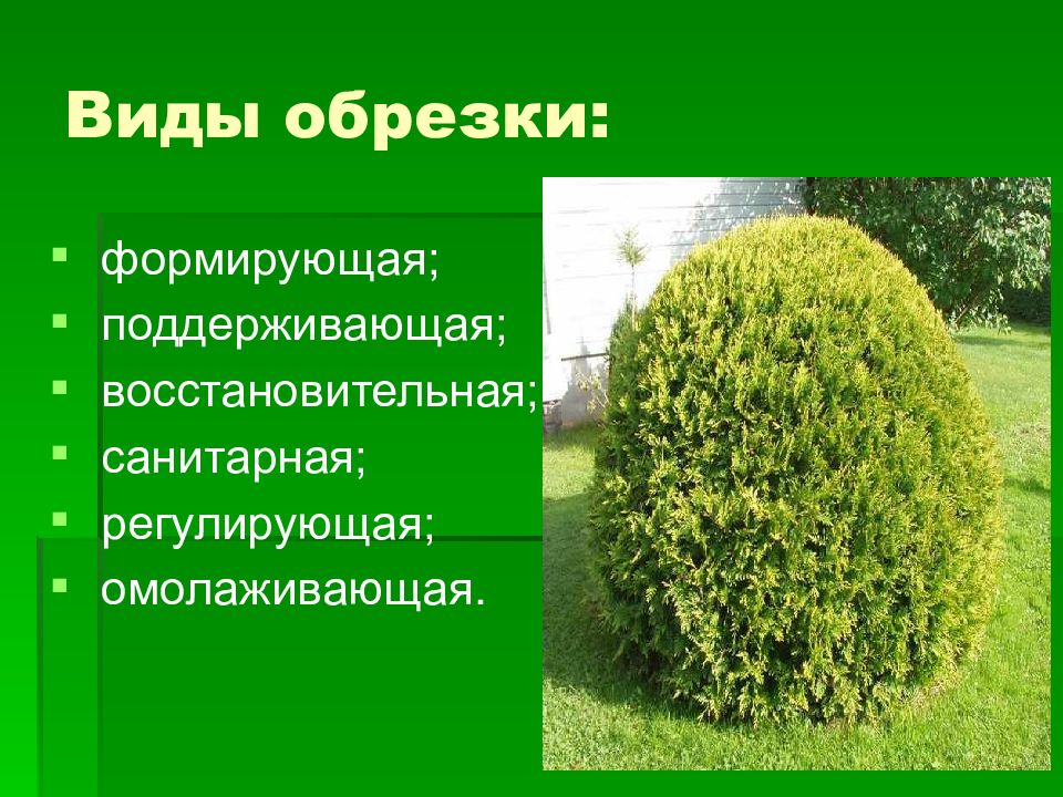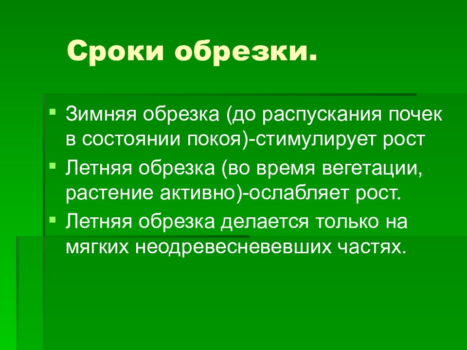 Зимняя обрезка (до распускания почек в состоянии покоя)-стимулирует рост Летняя обрезка (во время вегетации, растение активно)-ослабляет рост. Летняя обрезка делается только на мягких неодревесневевших частях.