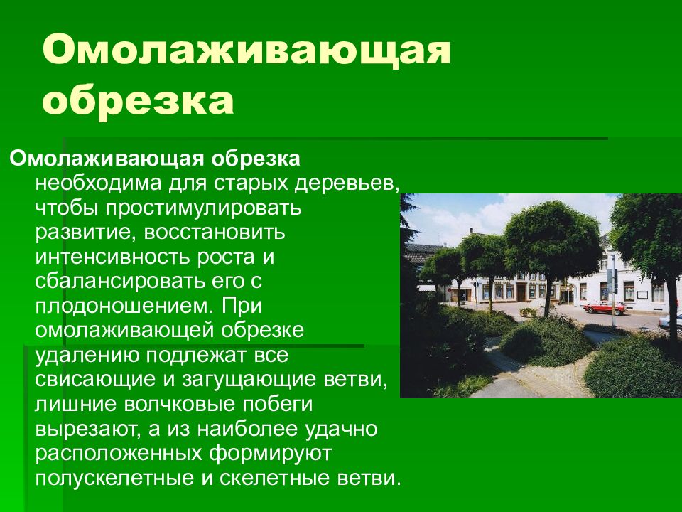 Омолаживающая обрезка необходима для старых деревьев, чтобы простимулировать развитие, восстановить интенсивность роста и сбалансировать его с плодоношением. При омолаживающей обрезке удалению подлежат все свисающие и загущающие ветви, лишние волчковые побеги вырезают, а из наиболее удачно расположенных формируют полускелетные и скелетные ветви.