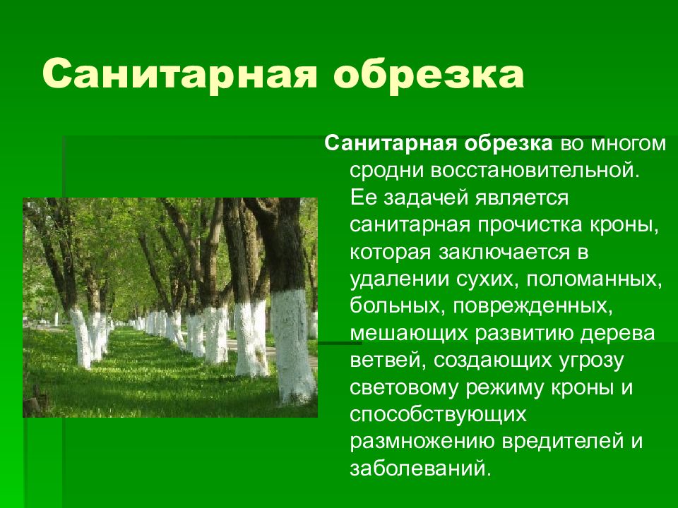 Санитарная обрезка во многом сродни восстановительной. Ее задачей является санитарная прочистка кроны, которая заключается в удалении сухих, поломанных, больных, поврежденных, мешающих развитию дерева ветвей, создающих угрозу световому режиму кроны и способствующих размножению вредителей и заболеваний.