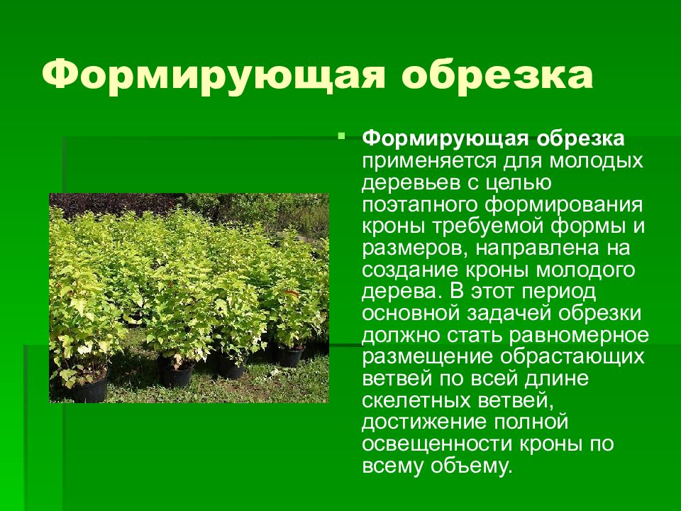 Формирующая обрезка применяется для молодых деревьев с целью поэтапного формирования кроны требуемой формы и размеров, направлена на создание кроны молодого дерева. В этот период основной задачей обрезки должно стать равномерное размещение обрастающих ветвей по всей длине скелетных ветвей, достижение полной освещенности кроны по всему объему.