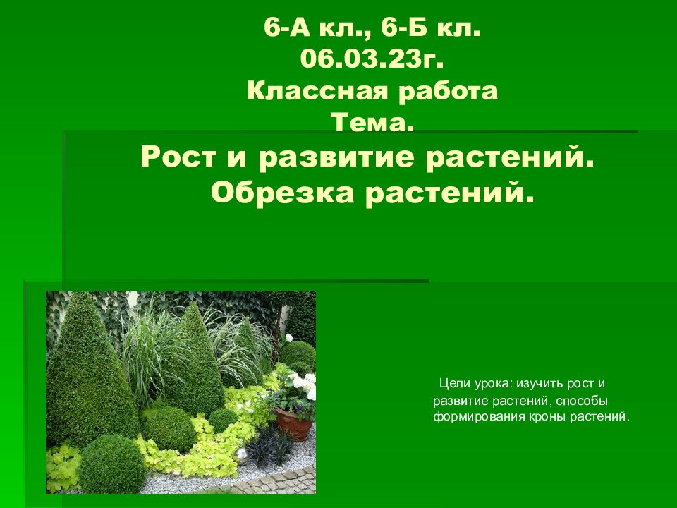 Первый слайд презентации: 6-А кл., 6-Б кл. 06.03.23г. Классная работа Тема. Рост и развитие растений. Обрезка растений