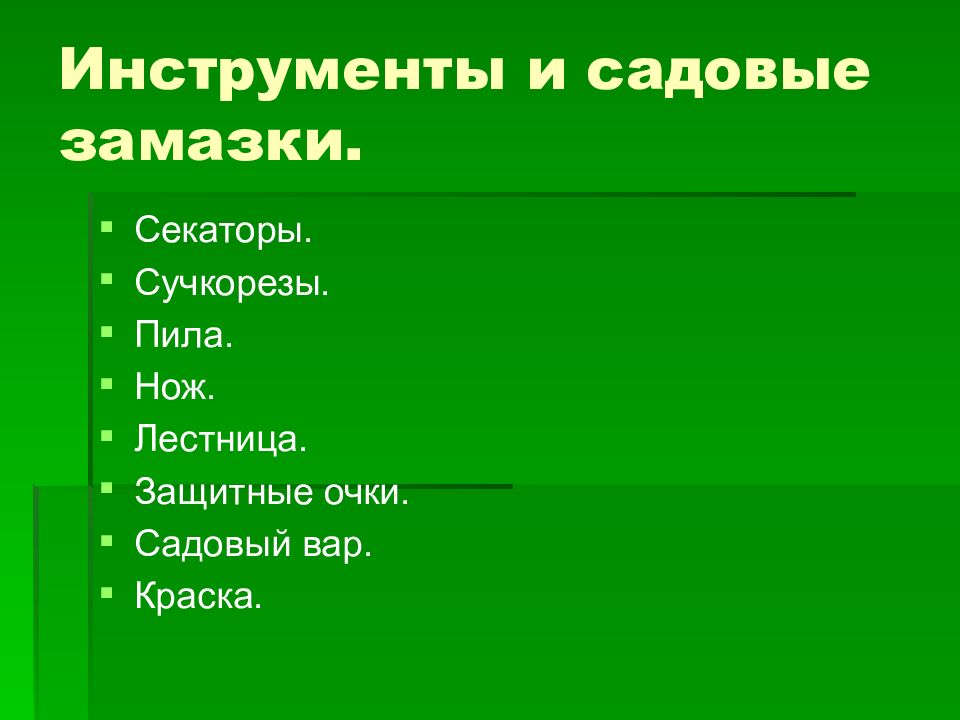 Секаторы. Сучкорезы. Пила. Нож. Лестница. Защитные очки. Садовый вар. Краска.