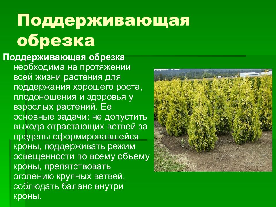 Поддерживающая обрезка необходима на протяжении всей жизни растения для поддержания хорошего роста, плодоношения и здоровья у взрослых растений. Ее основные задачи: не допустить выхода отрастающих ветвей за пределы сформировавшейся кроны, поддерживать режим освещенности по всему объему кроны, препятствовать оголению крупных ветвей, соблюдать баланс внутри кроны.
