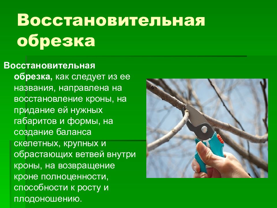 Восстановительная обрезка, как следует из ее названия, направлена на восстановление кроны, на придание ей нужных габаритов и формы, на создание баланса скелетных, крупных и обрастающих ветвей внутри кроны, на возвращение кроне полноценности, способности к росту и плодоношению.