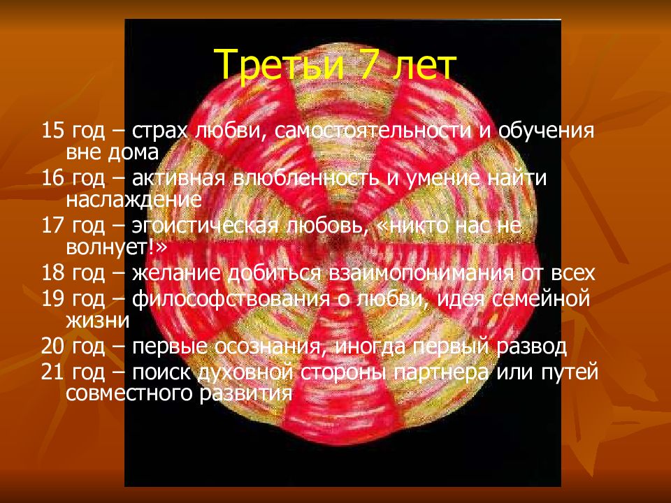 15 год – страх любви, самостоятельности и обучения вне дома 16 год – активная влюбленность и умение найти наслаждение 17 год – эгоистическая любовь, «никто нас не волнует!» 18 год – желание добиться взаимопонимания от всех 19 год – философствования о любви, идея семейной жизни 20 год – первые осознания, иногда первый развод 21 год – поиск духовной стороны партнера или путей совместного развития