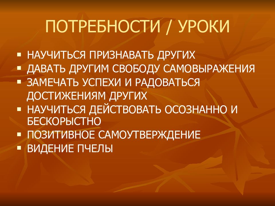 НАУЧИТЬСЯ ПРИЗНАВАТЬ ДРУГИХ ДАВАТЬ ДРУГИМ СВОБОДУ САМОВЫРАЖЕНИЯ ЗАМЕЧАТЬ УСПЕХИ И РАДОВАТЬСЯ ДОСТИЖЕНИЯМ ДРУГИХ НАУЧИТЬСЯ ДЕЙСТВОВАТЬ ОСОЗНАННО И БЕСКОРЫСТНО ПОЗИТИВНОЕ САМОУТВЕРЖДЕНИЕ ВИДЕНИЕ ПЧЕЛЫ