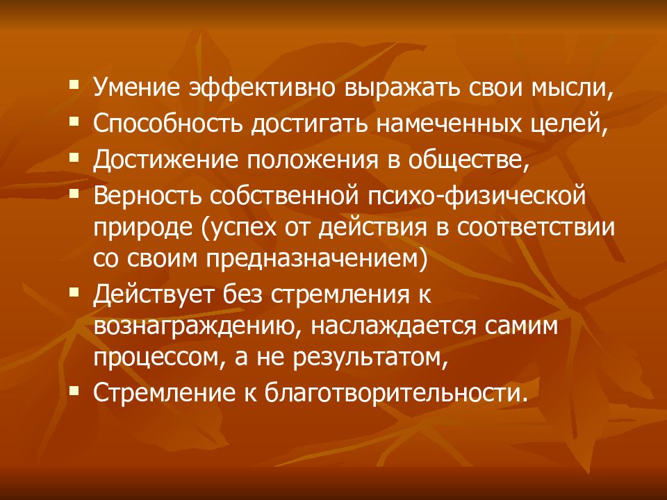 Умение эффективно выражать свои мысли, Способность достигать намеченных целей, Достижение положения в обществе, Верность собственной психо-физической природе (успех от действия в соответствии со своим предназначением) Действует без стремления к вознаграждению, наслаждается самим процессом, а не результатом, Стремление к благотворительности.