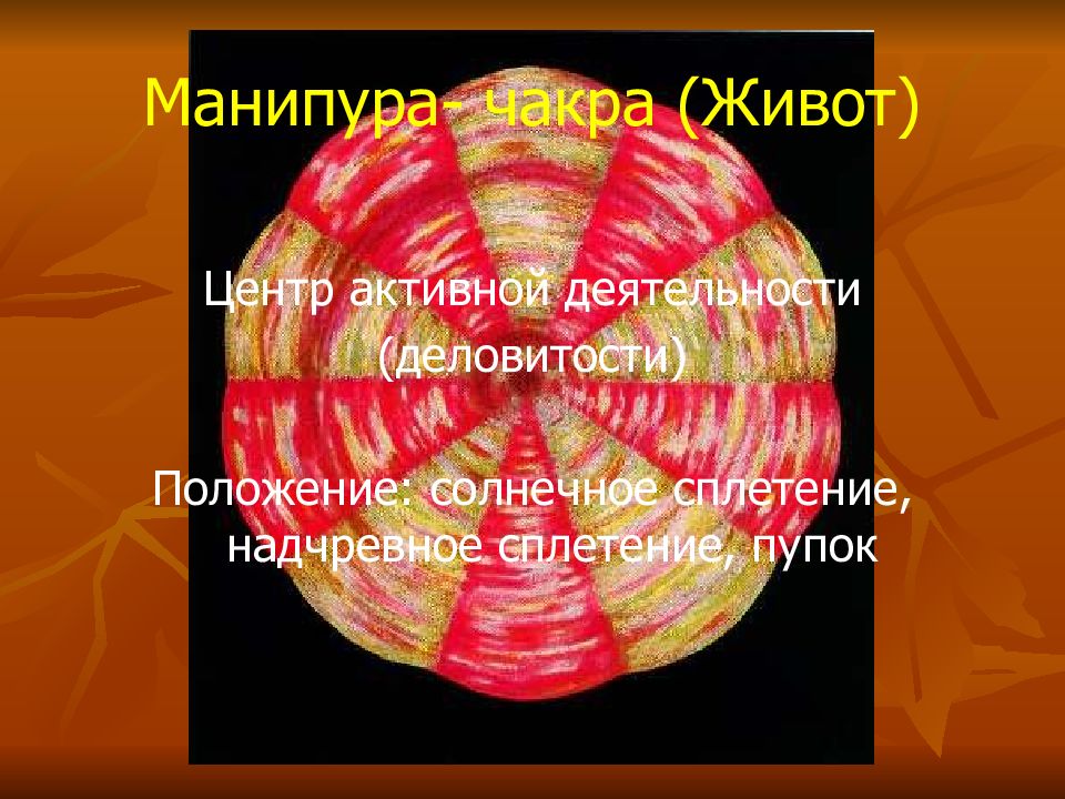 Центр активной деятельности (деловитости) Положение: солнечное сплетение, надчревное сплетение, пупок