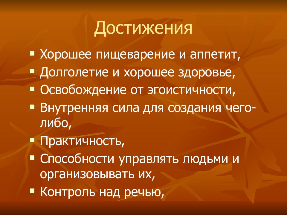 Хорошее пищеварение и аппетит, Долголетие и хорошее здоровье, Освобождение от эгоистичности, Внутренняя сила для создания чего-либо, Практичность, Способности управлять людьми и организовывать их, Контроль над речью,